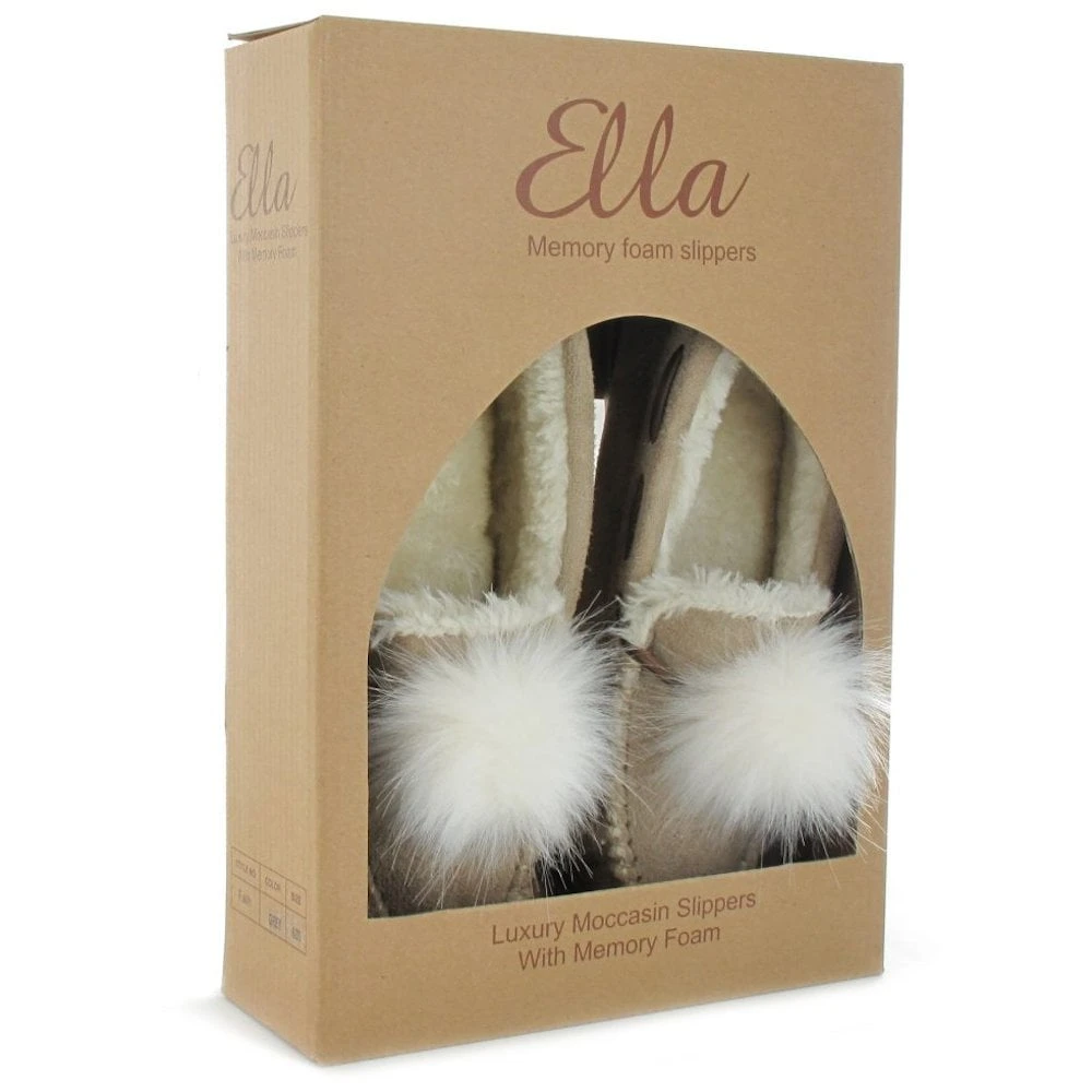 Luxury Ladies Moccasin Slippers that have a memory foam insole and are fully fur lined accompanied with a Faux Fur Pom detail.