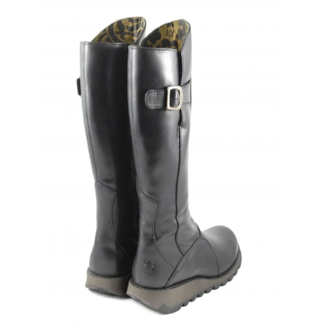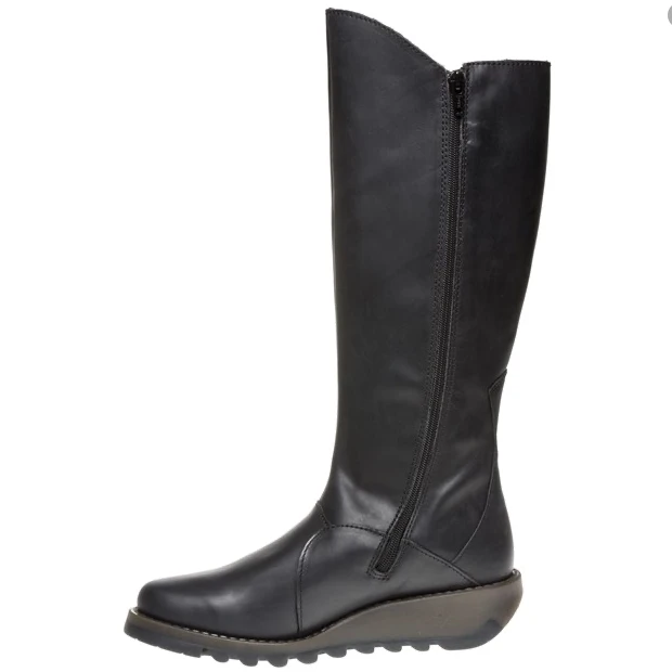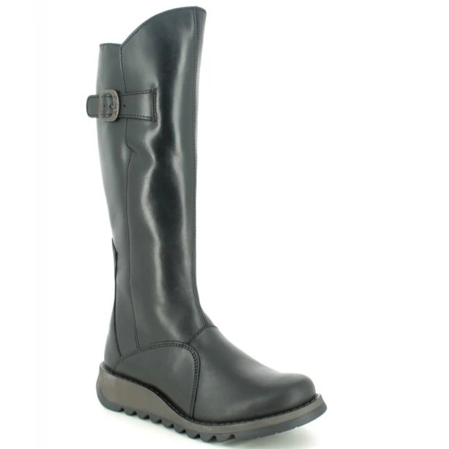 Fly London Mol black is a classic knee high boots with a low wedge heel and 1 side buckle with an inside zip for easy pull-on and fits neatly to the leg.