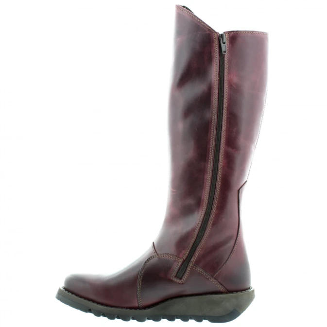 Fly London Mol is a classic knee high boots with a low wedge heel and 1 side buckle with an inside zip for easy pull-on and fits neatly to the leg.
