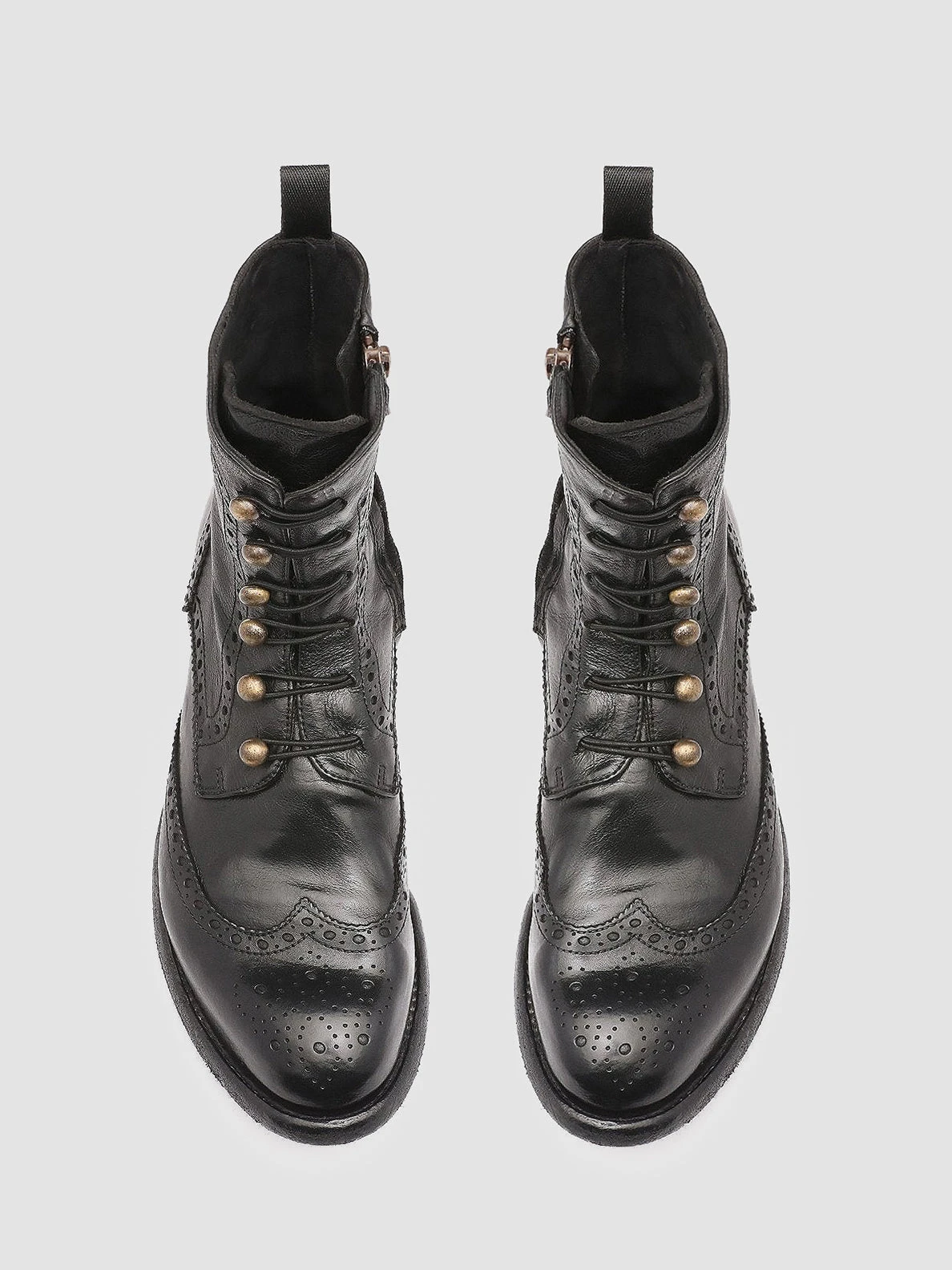 Refined details of classic elegance embellish our comfortable Lexikon artisan ankle boots. They are crafted from very high quality black soft leather and have an almond-shaped silhouette brogue motif an exclusive front closure with gold-tone pearl buttons and elasticated eyelets side zip fastening grosgrain heel pull tab and a leather sole with low stacked heel and tread rubber inserts.