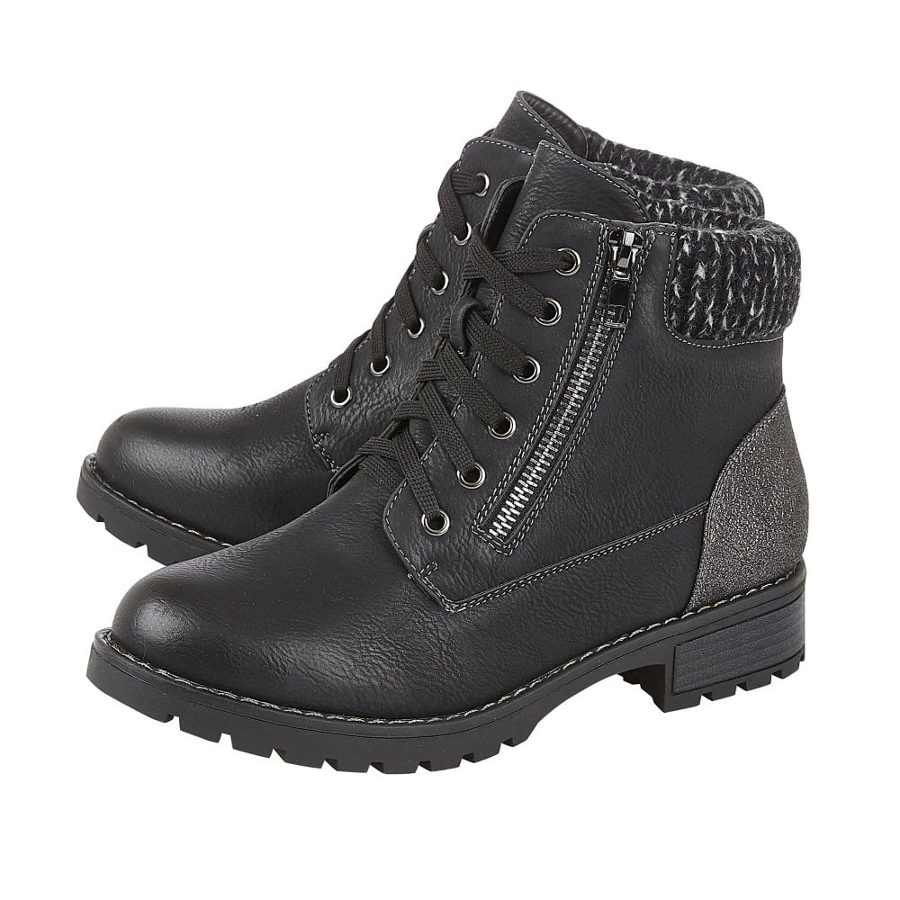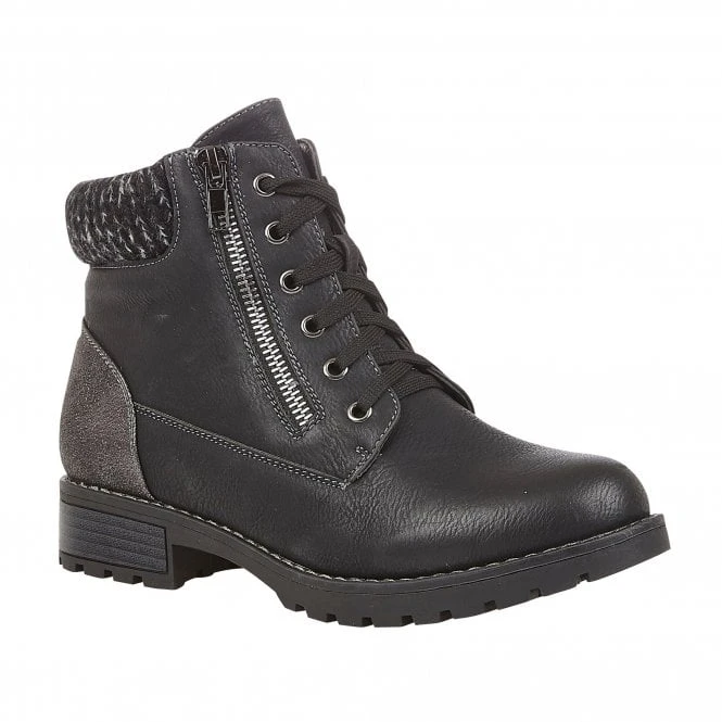 Up your casual boot game and embrace the hiking boot trend with the Lotus Emmeline. This womenโs lace-up boot boasts a cleated sole unit, a multi-coloured padded ankle collar, contrasting heel counter and decorative zip detailing.ย Style and function certainly come together on this Lotus casual black ankle boot.