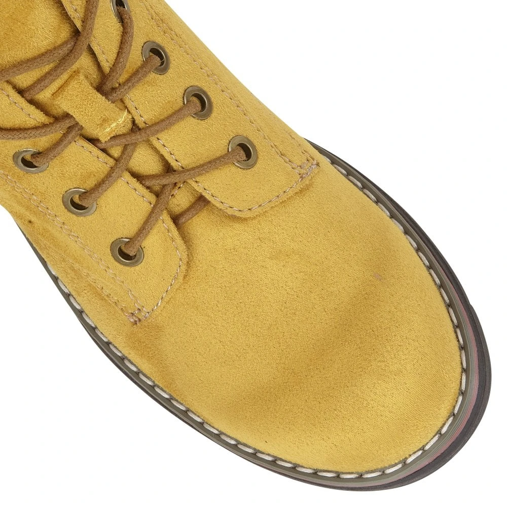 Boost your off duty looks with the Lotus Sycamore lace-up ankle boot. Taking elements from the hiker boot trend, this mustard imi-suede ankle boot encompasses a number of eye-catching finishes to give the boot statement style. A multi-coloured knitted ankle collar contrasts against the upper, as does the contrast stitching and the gold metal eyelets that interlink with the lacing to give a secure fit. The serrated sole unit also adds to the aesthetic of this casual Lotus women’s boot that has a modern day vibe.