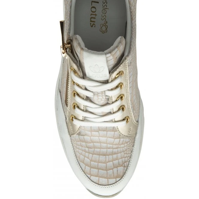 Make a style statement whilst enjoying exceptional comfort with the Sassy women’s trainer from Stressless by Lotus. This cream lace-up sneaker boasts a mock-croc printed premium leather upper that is accentuated by contrasting metallic trims, a functional zip and an on-trend 4.5cm wedge heel. What makes this Lotus women’s lightweight trainer extremely wearable and unbelievably comfortable is the shock absorbing properties within the cushioned insock.