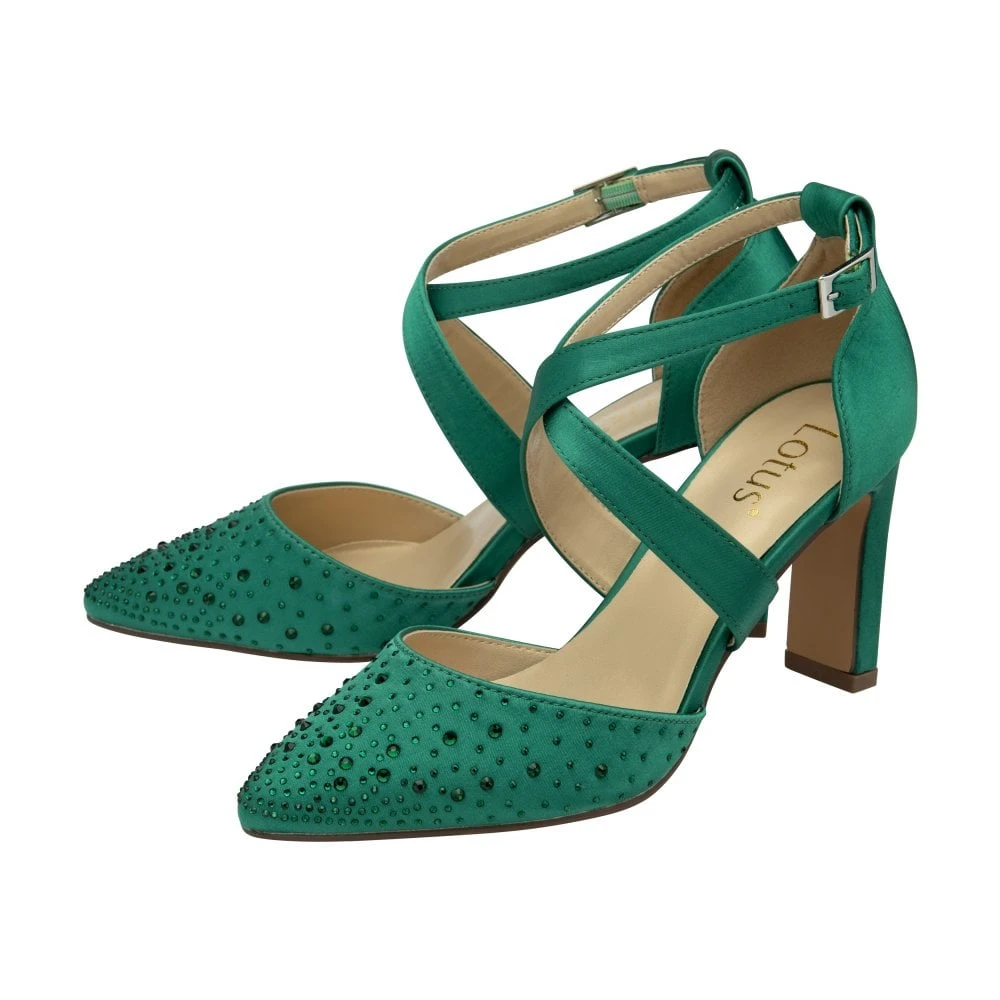 Make a stylish entrance to any glamorous soiree this season in the Lotus Leona court shoe. This pointed toe emerald green court shoe is the optimum of chic. With an abundance of sparkling diamantes encapsulated on the satin upper, sleek crossover straps that fasten with a delicate buckle at the ankle and a chiselled 9cm heel, this Lotus women’s court shoe will certainly take your party looks to the next level! The Leona heeled pump also coordinates with the compact Mirabel box bag, which will undoubtedly complete any special occasion look.