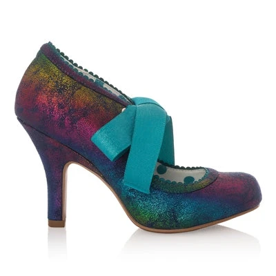 Popular hi-cut court shoe WILLOW’s stunning rainbow metallic uppers, trimmed with a rich blue scallop edging, feature statement ribbon ankle ties. Classic polka-dot linings complete the look. Ruby Shoo WILLOW matches perfectly to Ruby Shoo bag style MALIBU