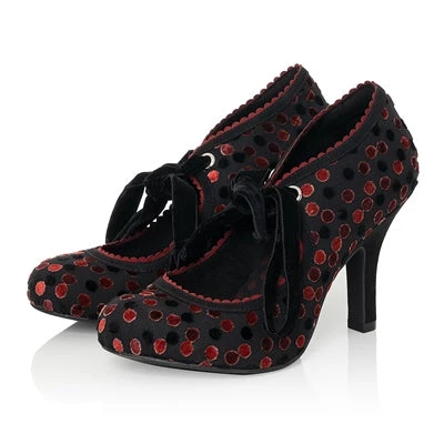 Popular hi-cut court shoe WILLOW’s bold red and black polka dot velvet uppers, trimmed with a sweet red scallop edging, feature statement velvet ribbon ankle ties. Red and black satin polka-dot linings complete the retro look. WILLOW matches perfectly to Ruby Shoo bag style ALBERTA.