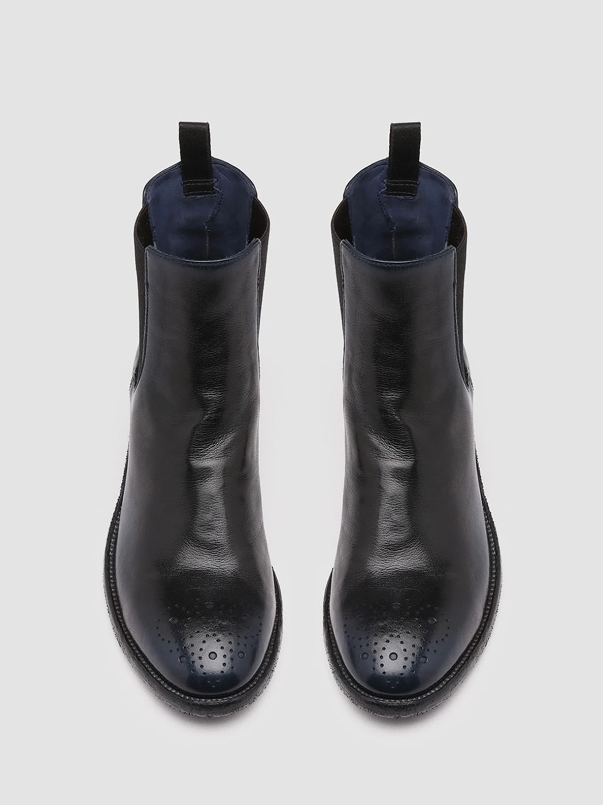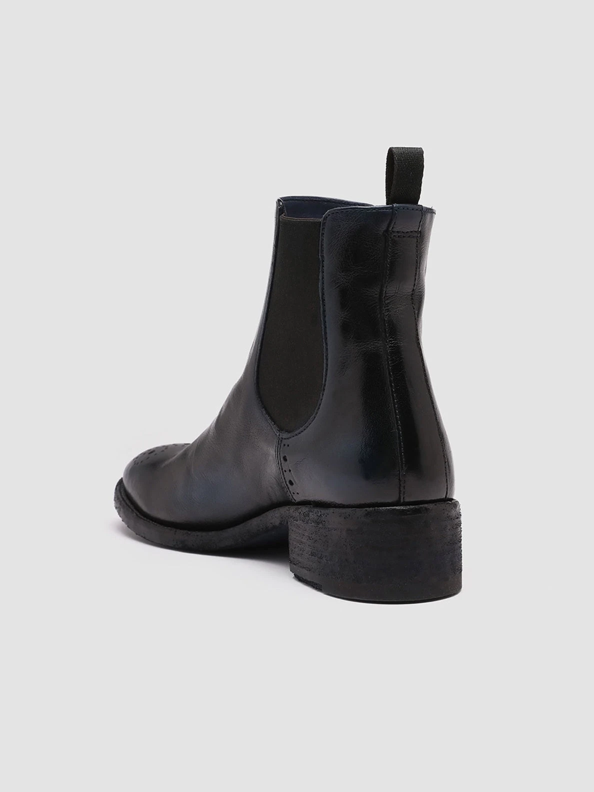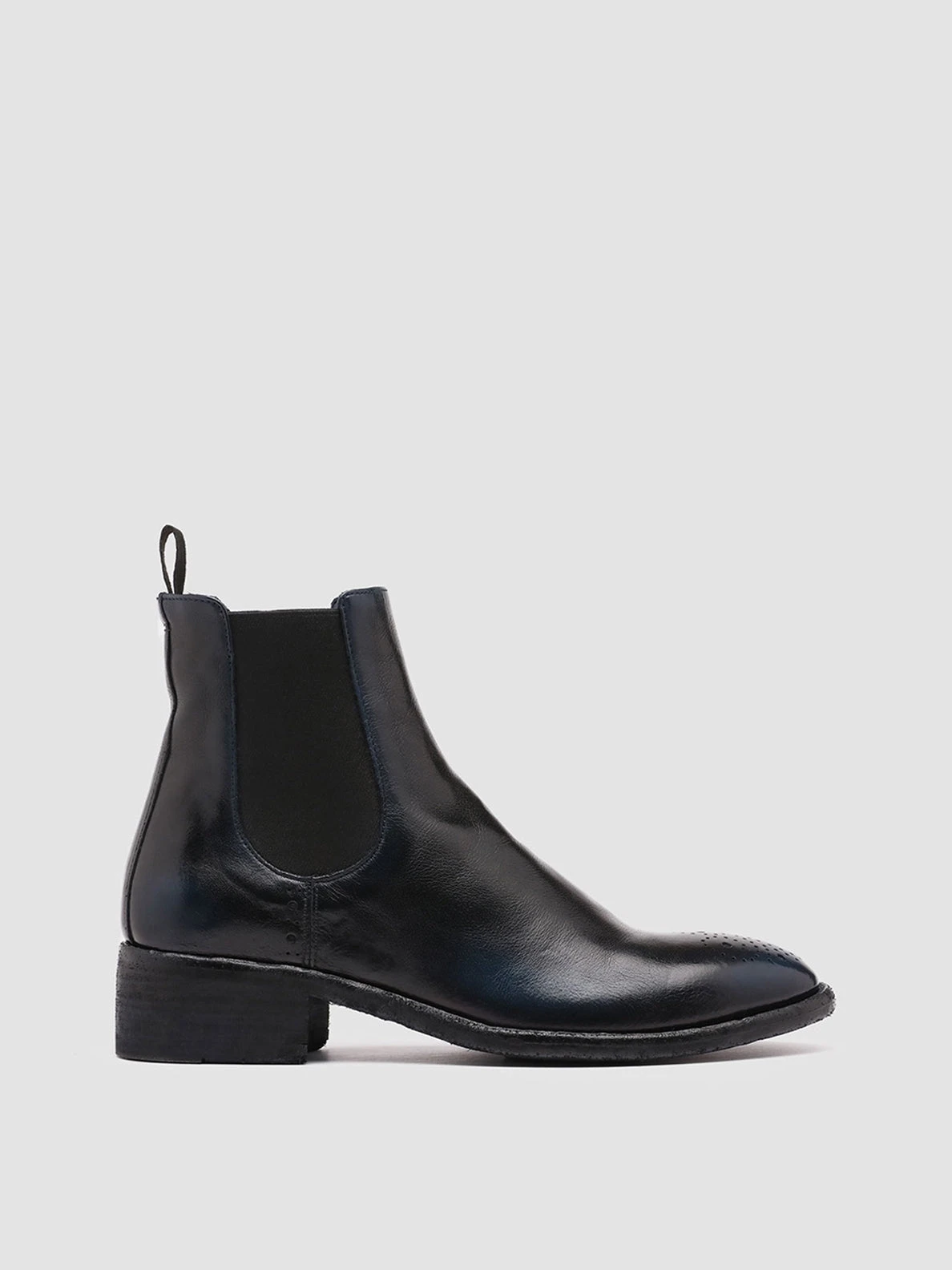 Seline ankle boots are our most refined interpretation of classic Chelsea style. They are made from fine leather defined by the airbrushed technique in shades of black and navy blue and have the toe and sides embellished by a sleek brogue motif elasticated side inserts and grosgrain heel pull tab for a perfect fit and leather sole with low stacked heel.