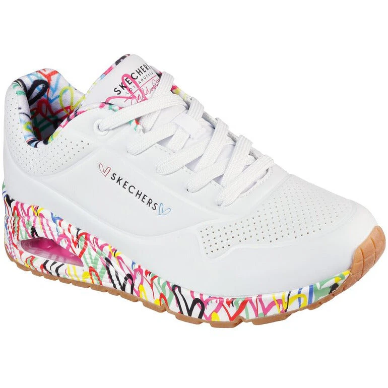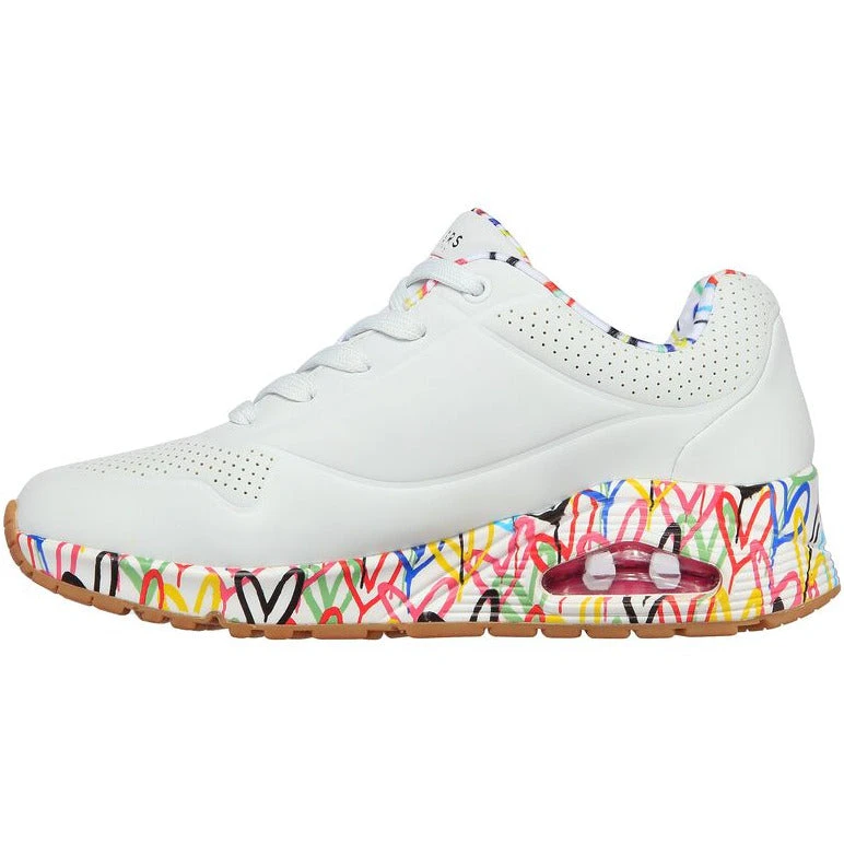 Internationally renowned muralist James Goldcrown brings his iconic #Lovewall heart designs to Skechers in this inspiring collaboration. Walk with ‘Love’ wherever you go in the Skechers x JGoldcrown: Skechers Street⢠Uno – Loving Love. This lace-up fashion sneaker features the artist’s signature heart print trim, synthetic durabuck and perforated trimmed upper with a Skechers Air-Cooled Memory FoamĀ® insole, and a platform wedge with visible Skech-AirĀ® air-cushioned midsole.